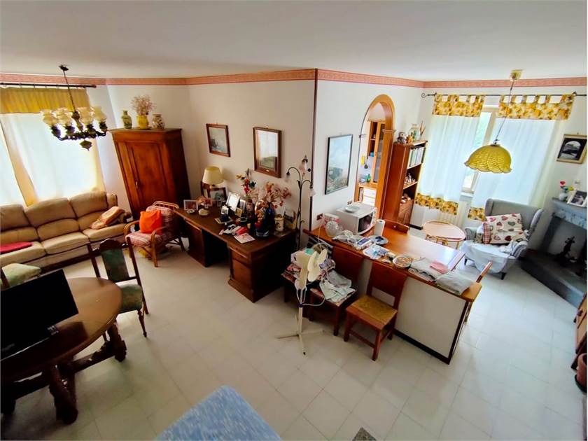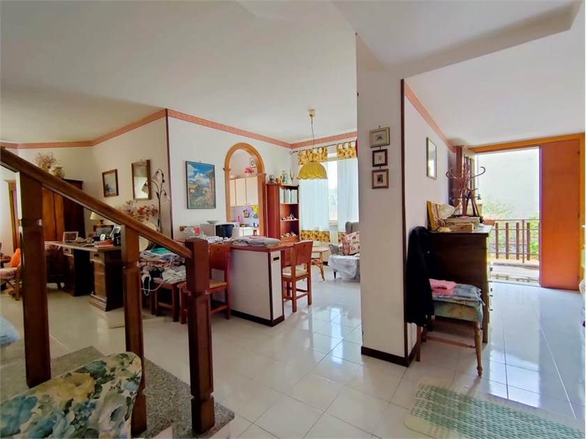 Internamente l'abitazione è divisa su tre livelli per una metratura totale di 220 mq composta da ingresso, soggiorno, tinello con camino, cucinotto e bagno al piano rialzato, 2 camere matrimoniali con terrazza, 1 ulteriore camera matrimoniale, cameretta con balcone, bagno e soffitta al piano superiore.